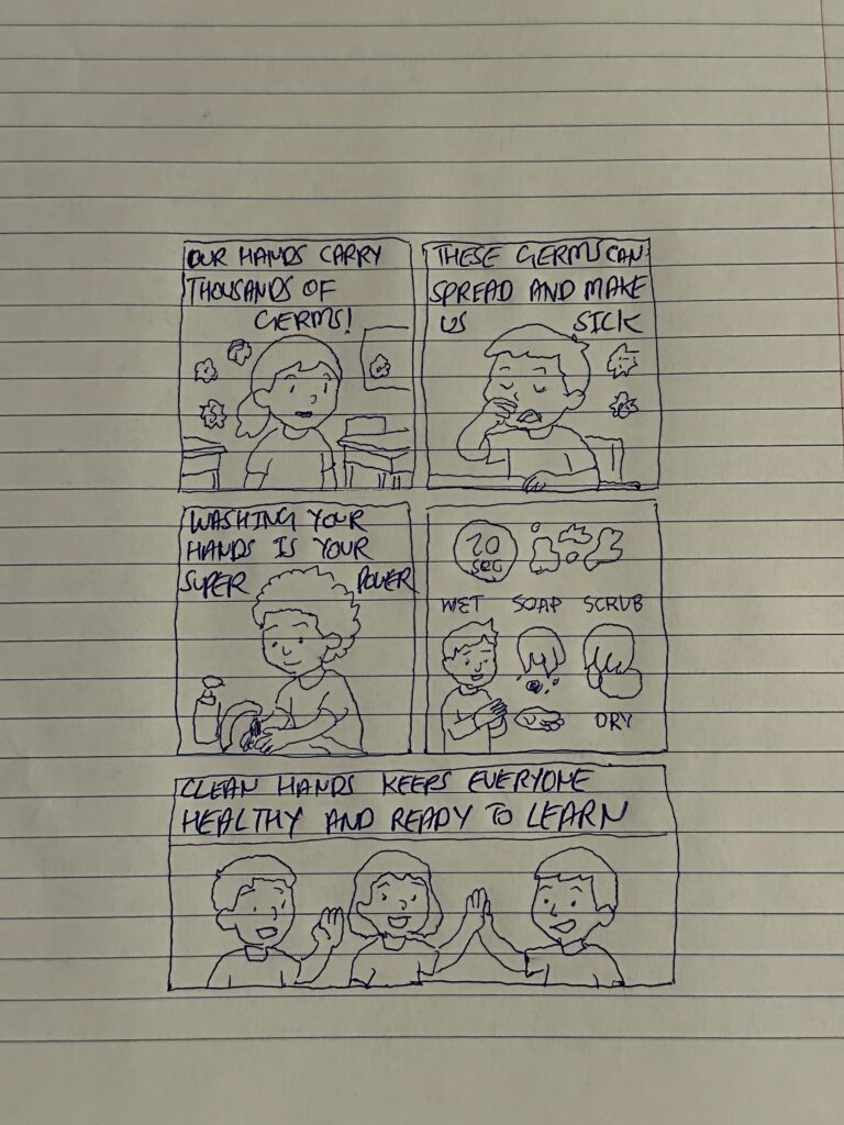 The main objective of the brainstorming stage was to find different types of methods through which we can make the concept of hand hygiene both easy to understand and visually engaging for the students in elementary school. We found various resources highlighting the importance of handwashing practice, but the ones that stood out to us were the Centers for Disease Control and Prevention (CDC) and the World Health Organization (WHO), which provided the foundation for proper handwashing steps. Other than written resources, we dove into the educational short videos designed for the children, as well as the posters and charts in the classrooms on the topic of hand hygiene. These resources highlighted effective strategies, such as colorful visuals and demonstrations, while avoiding common mistakes like overloading information or using technical terms that are hard to understand.